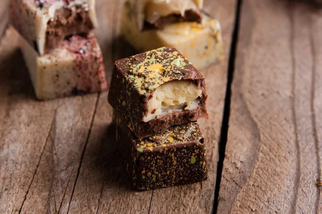 5 bombones rellenos de maracuya, recubiertos de chocolate con leche.